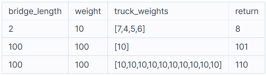 solution 함수의 매개변수로 다리에 올라갈 수 있는 트럭 수 bridge_length, 다리가 견딜 수 있는 무게 weight, 트럭 별 무게 truck_weights가 주어집니다. 이때 모든 트럭이 다리를 건너려면 최소 몇 초가 걸리는지 return 하도록 solution 함수를 완성하세요.