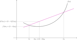 함수 위의 임의의 두 점을 연결하는 선을 그래프에 그었을 때, 그 선이 아래 그림과 같이 함수 그래프의 위쪽만을 지나가면 이 함수는 Convex한 함수라고 할 수 있다.