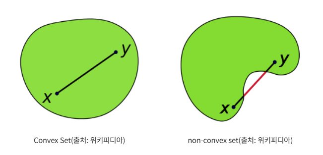- Convex 집합은 집합이 이루는 공간 내의 두 점을 연결한 선분이 그 집합 안에 포함되는지, 포함되지 않는지에 따라 Convexity가 갈린다.