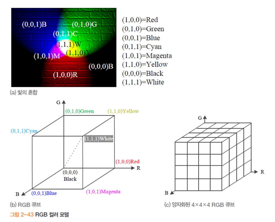 - 일반적으로 각 성분을 0 ~ 1 사이의 숫자나 0 ~ 255 사이의 정수로 표현한다.