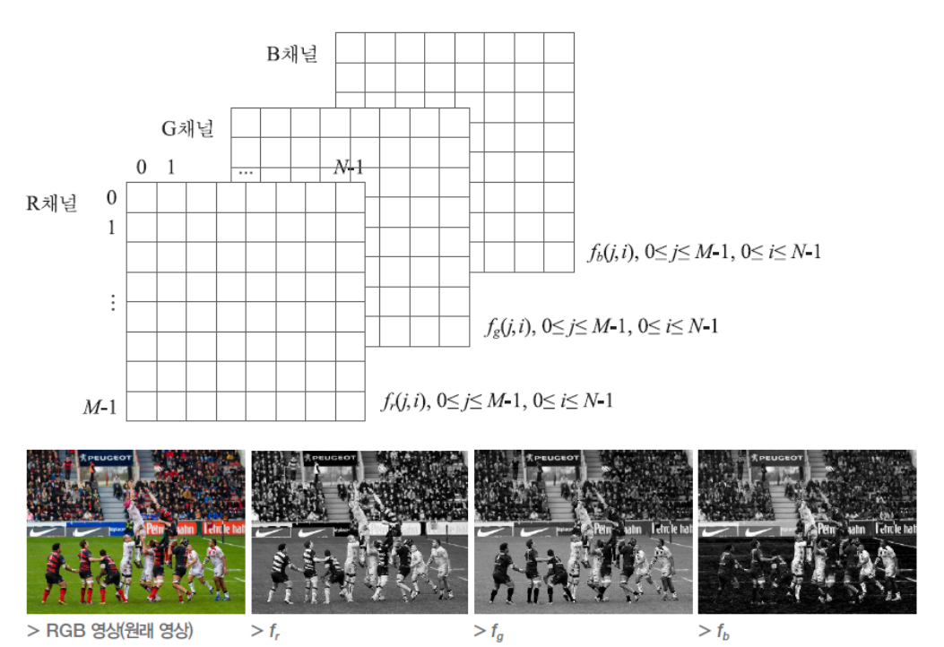 컬러 영상은 우리가 봤을 때는 하나의 영상 평면이지만 실제로는 R, G, B 세 영상 평면으로 구성되어있다.