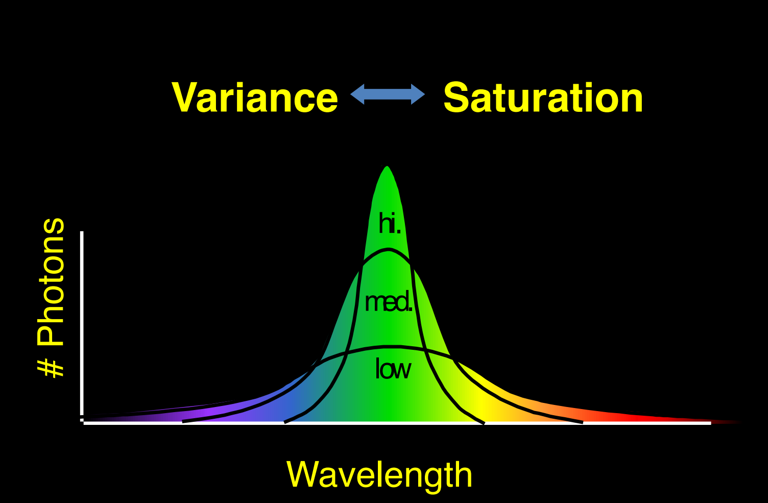 - low - 빛이 많이 퍼져 있다. 빨주노초파남보의 색이 모두 다 들어오게 되니까 하얗게 보이게 된다.