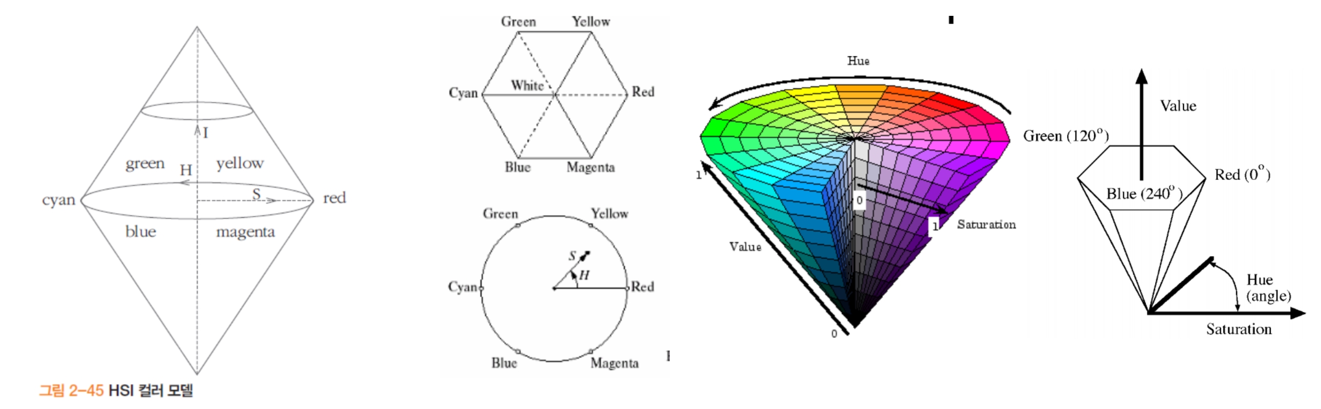 - RGB가 정육면체로 표현되는 것처럼 HSV나 HSI는 이중 콘으로 표현하고 있다.