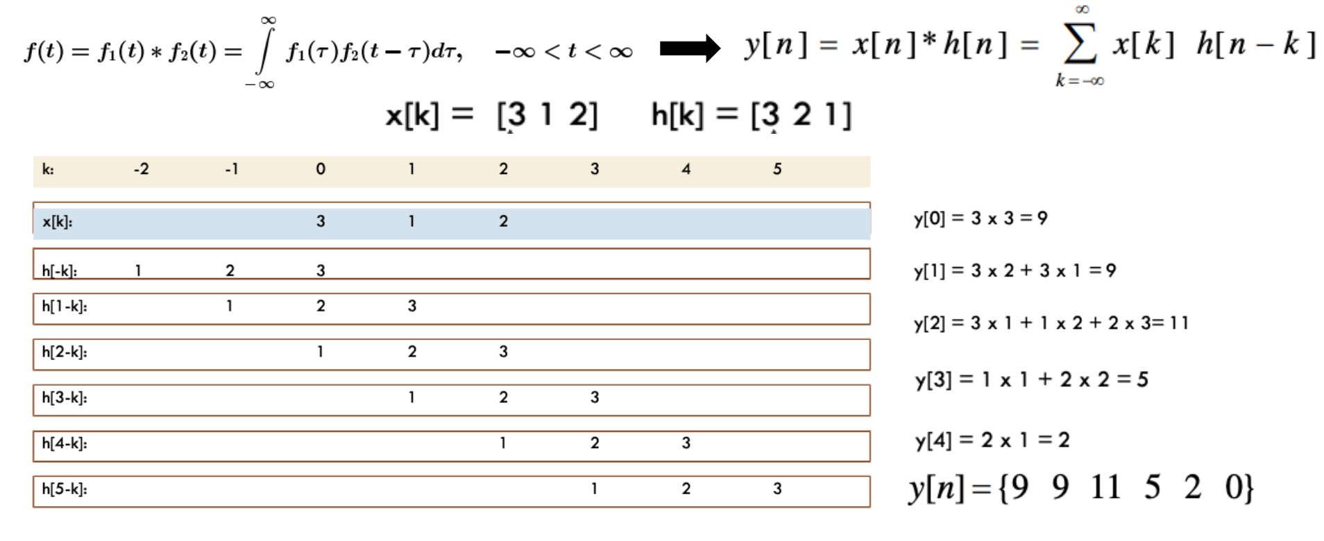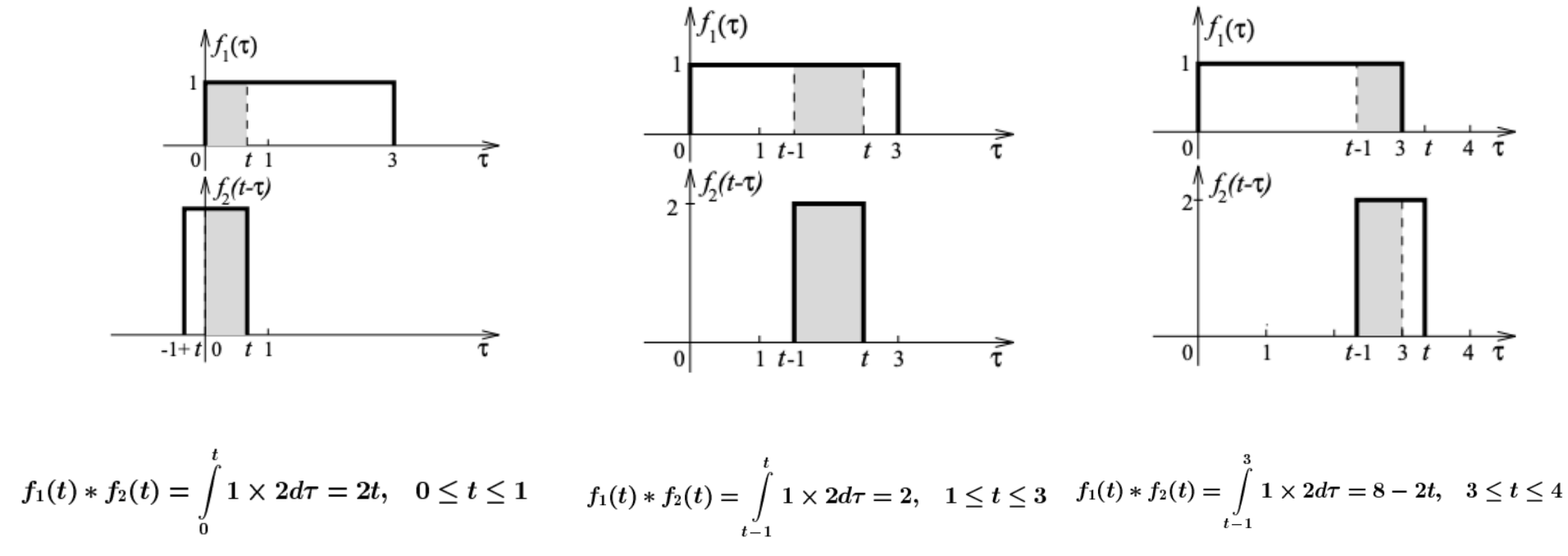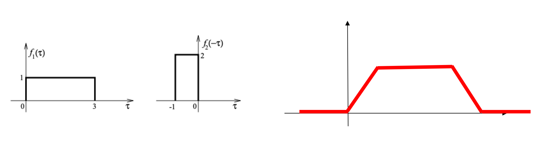 - Step 2: t를 더한 후, 음의 무한대에서부터 양의 무한대까지 선택한 함수를 이동시키면서 두 함수의 곱의 적분 값을 찾는다.