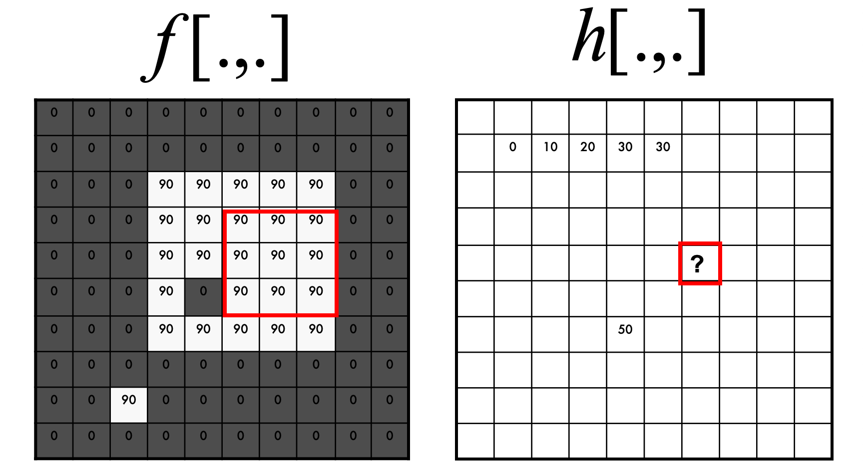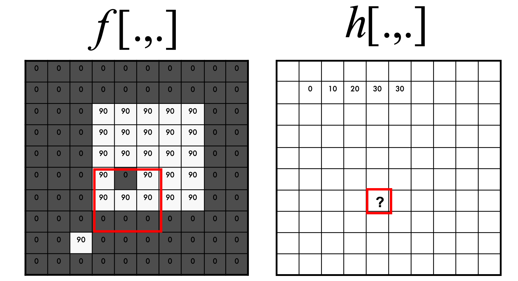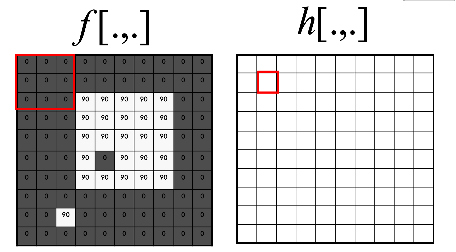 - 이미지 내 구하고 싶은 픽셀값에 필터의 중심을 둔다. 필터의 가중치들과 겹쳐진 이미지 픽셀의 값들을 곱해서 모두 더한다. 결과를 새로운 이미지에서의 픽셀 값으로 결정한다.