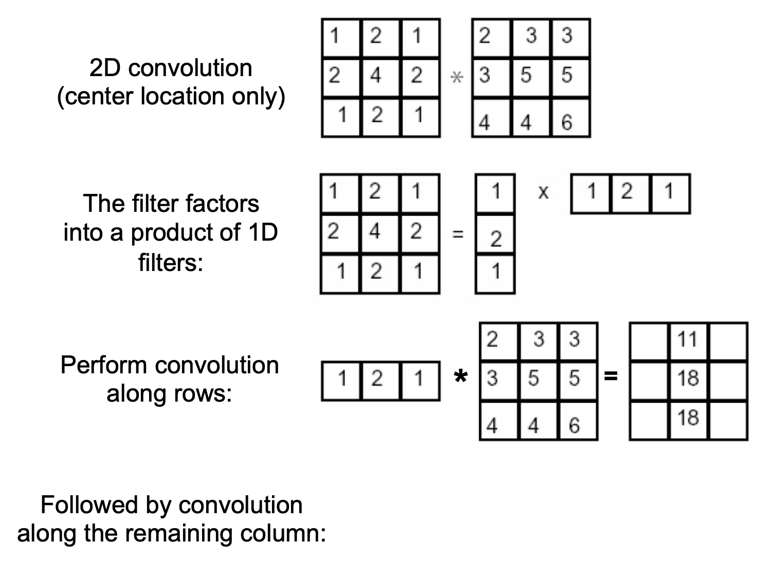 - 입력영상에 대해서 x축 기준 가우시안 마스크를 적용하고 난 뒤, 그 결과를 y축 가우시안 마스크를 적용한다. y축 적용은 이전 픽셀의 x축 적용 결과와 다음 픽셀의 y축 적용 결과를 합산하기만 하면 되며, 수식을 풀어보면 2차 가우스 함수 필터를 적용한 값과 동일하다.