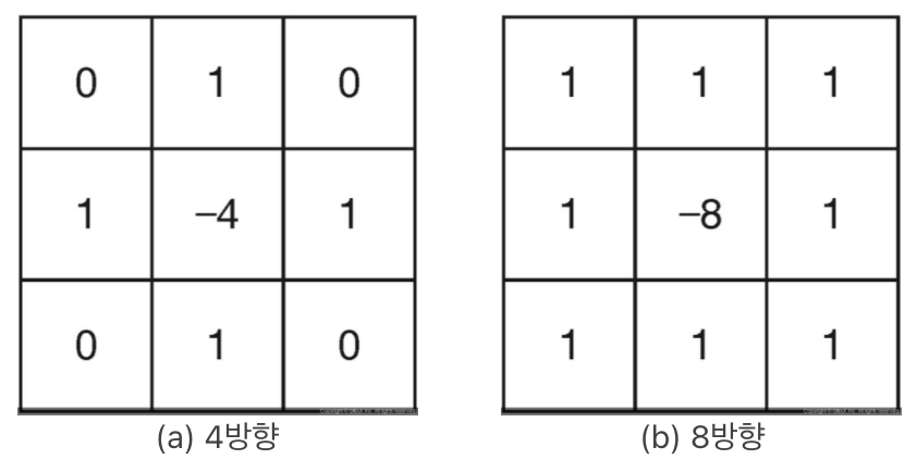 - 위 수식은 마스크 형태로 나타낼 수 있으며, 이를 라플라시안 필터 마스크라고 한다.